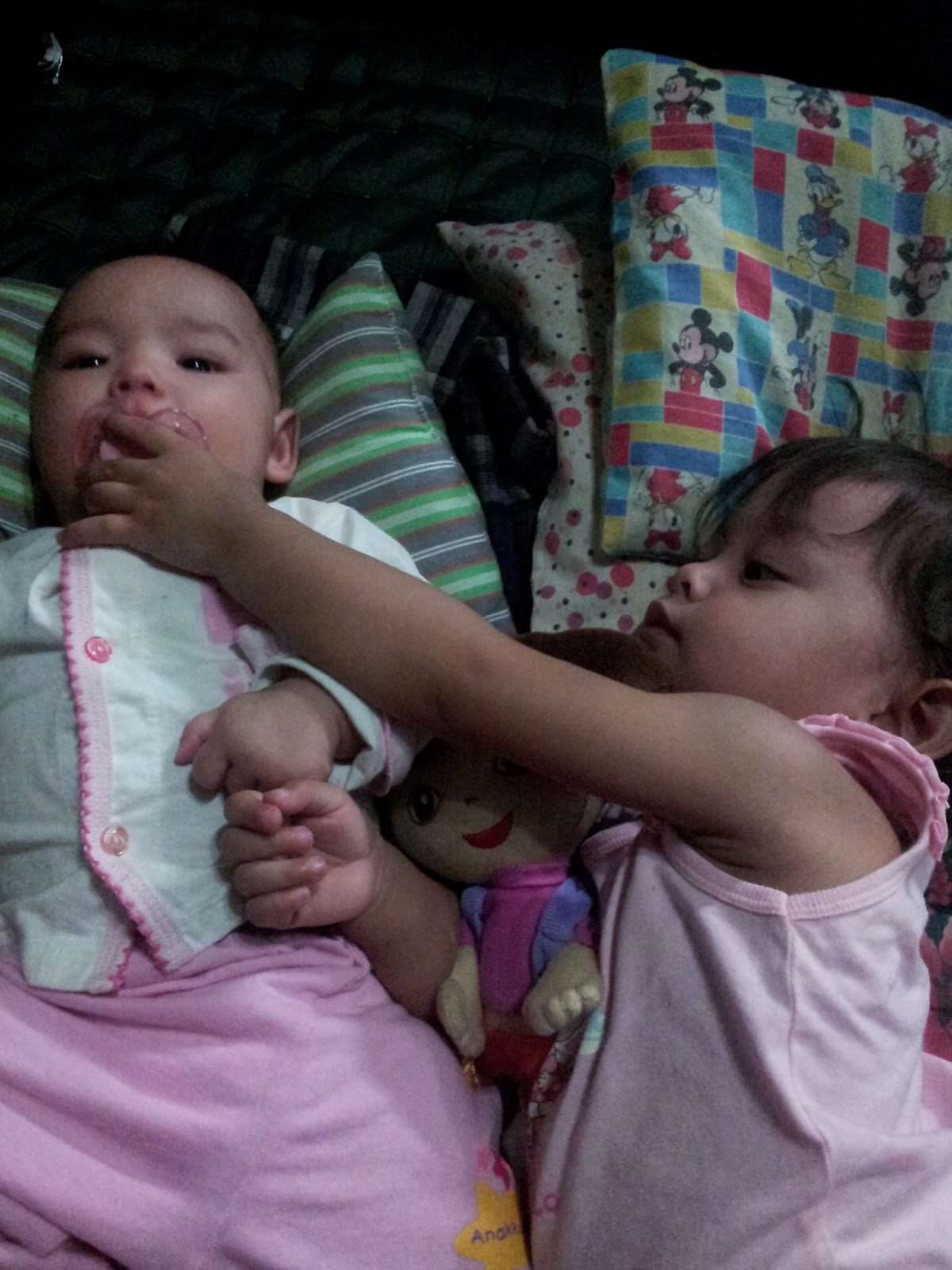 | kakak dah menurun perangai abang.suka pegang tangan adik dia..dia ikut apa abg buat kat dia.. |